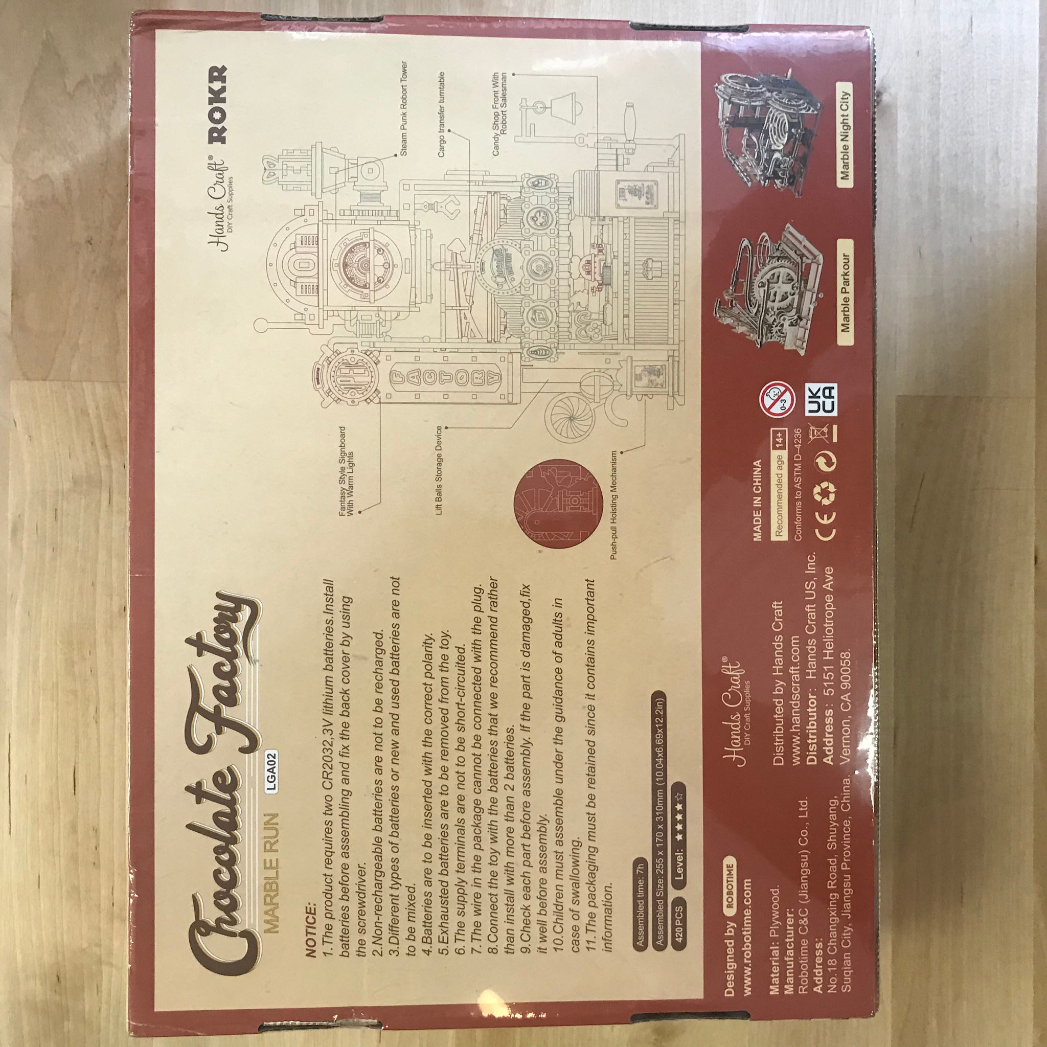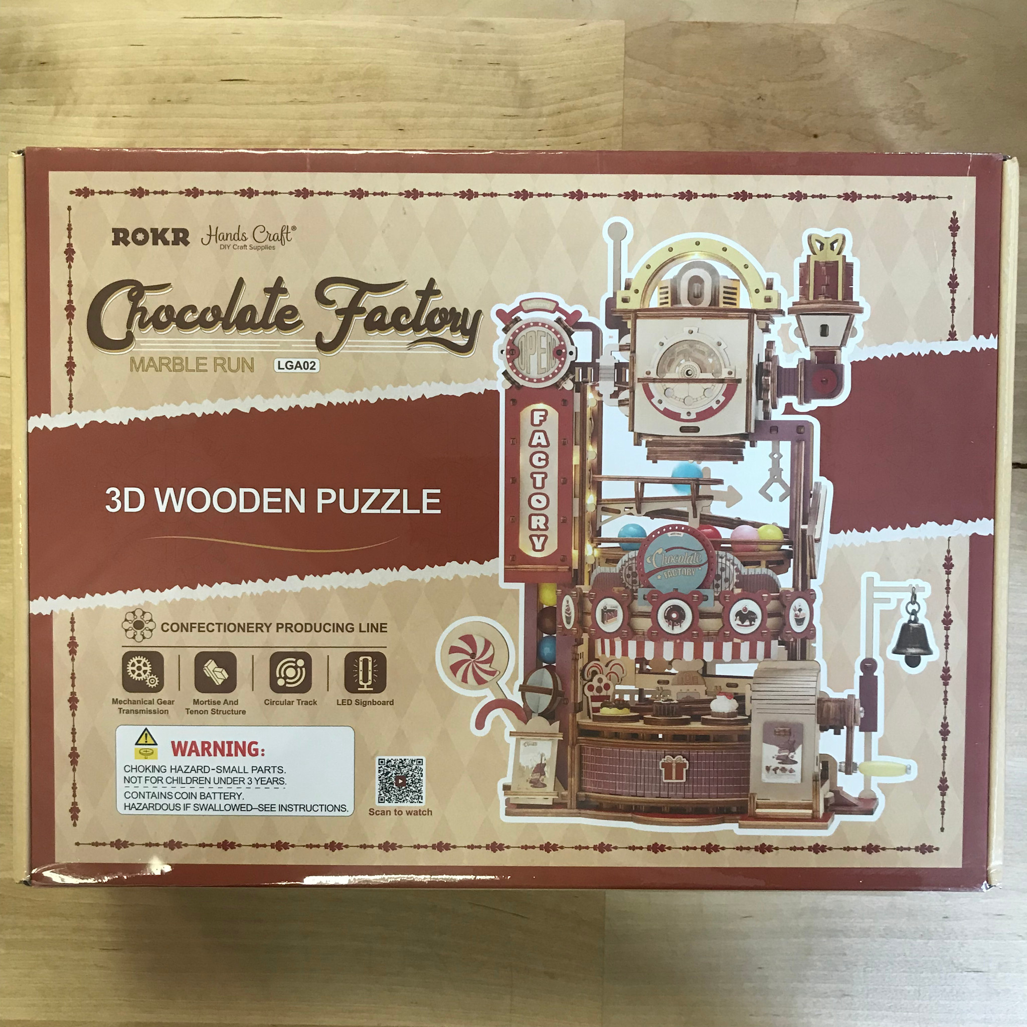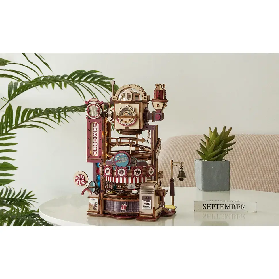 The Chocolate Factory marble run features a colorful design, lights, and glossy marbles in various colors. It's an intricate 3D wooden puzzle that showcases an effective engineering design combined with lots of fun aspects. Full of twists, turns, and spirals, this marble run is a thrill to watch! It is run completely by mechanical means—no battery needed!
