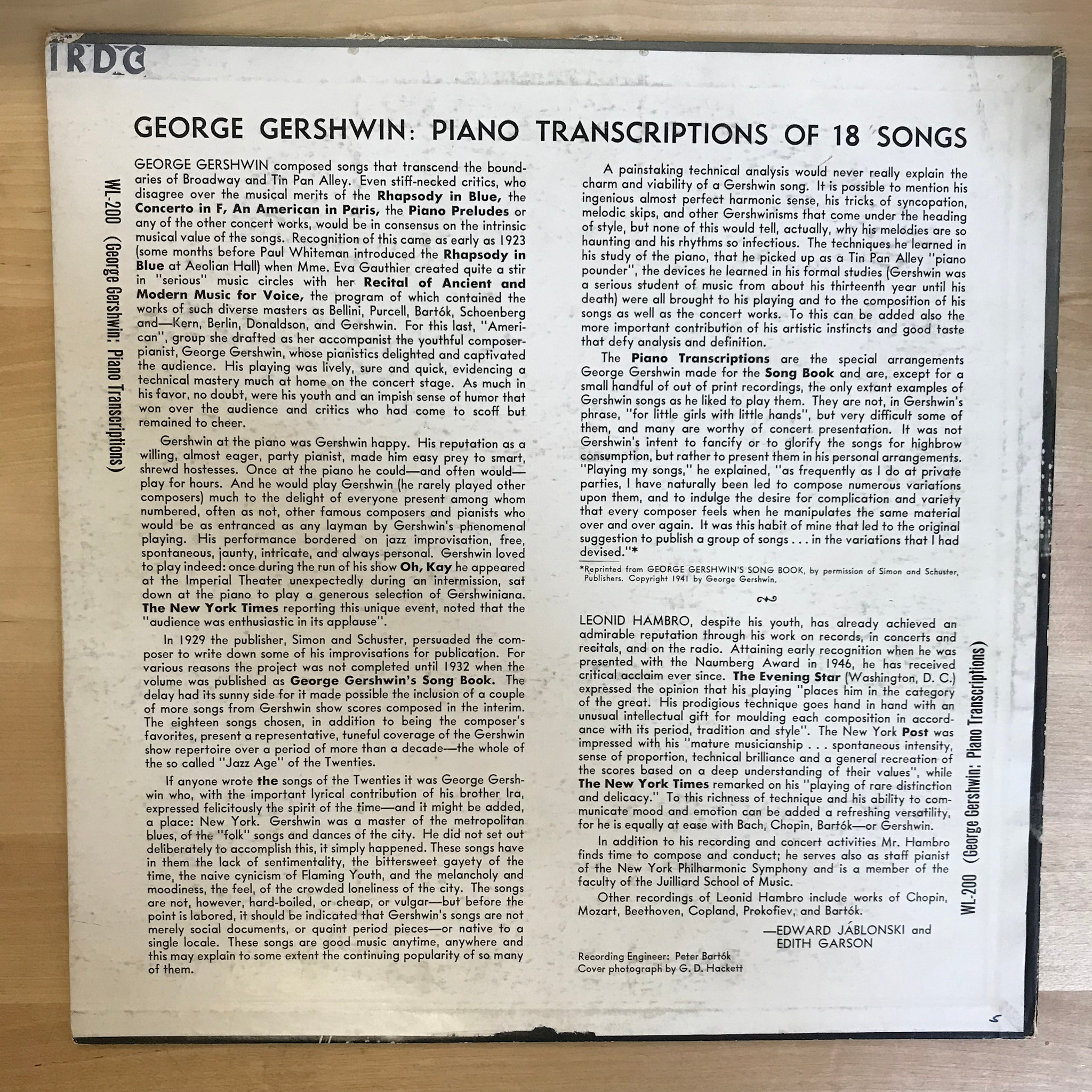 Leonid Hambro – George Gershwin: Piano Transcriptions of 18 Songs - WI 200 - Vinyl LP (USED)